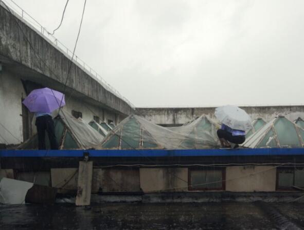 8月9日上午,天突然下起大雨。蕭山商業(yè)城五金市場(chǎng)管理人員準(zhǔn)備了塑料油布,冒著大雨爬上市場(chǎng)頂層的玻璃棚,為玻璃棚漏雨之處鋪上油布。
