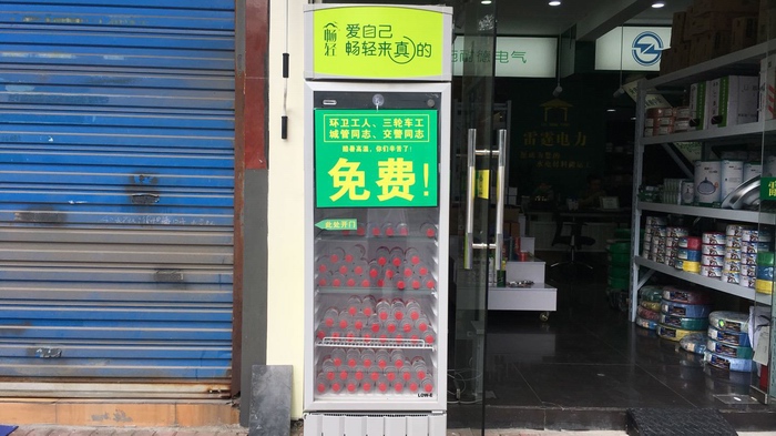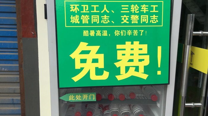 近日,連續不斷的高溫天氣炙烤著商業城內的一線戶外工作者。蕭山商業城經營戶自發在城內設置了免費“愛心冰柜”,給在高溫酷暑下工作的人們送去了清涼。