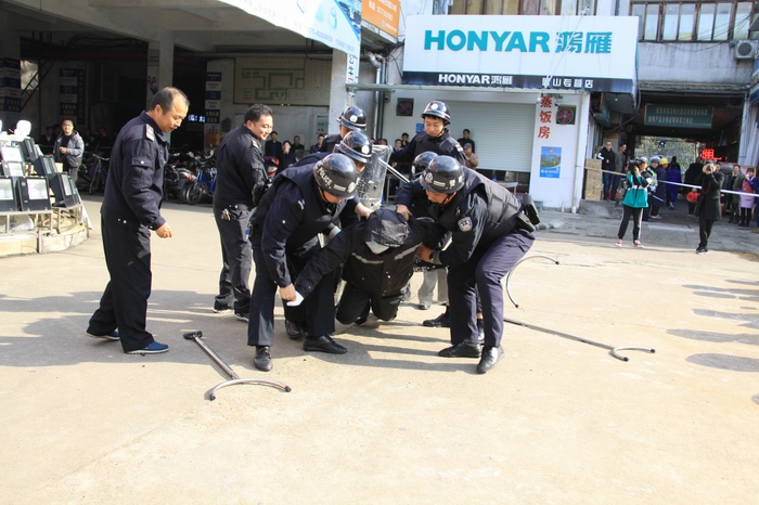 本次演練采取“模擬場景,實戰演練”的方式,共設有防爆炸、防刀斧砍殺演練和民兵應急拉練三大項目。防爆炸模擬演練地點設在倉儲市場,巡防隊員發現可疑爆炸物后,立即向指揮長匯報,并及時啟動反恐防暴應急預案開展處置工作。防刀斧砍殺模擬演練地點設在建材市場消防池附近,商業城反恐隊員現場模擬對抗持刀歹徒,結合當前反恐工作實際,對劫持人質、刀斧砍殺、駕車沖撞等恐怖襲擊事件進行處置演練,最大限度的確保群眾生命財產安全。民兵應急拉練地點設在商業城生態停車場籃球場,應急分隊現場演示擒敵術、格斗術、臂盾運用等基礎警務技能,受到現場觀摩者的贊嘆。