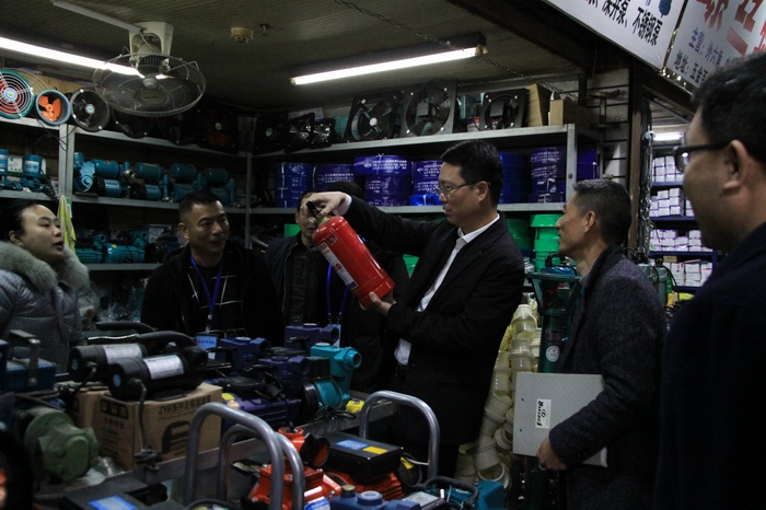 在五金市場(chǎng),董事長(zhǎng)對(duì)場(chǎng)內(nèi)的消防設(shè)施設(shè)備進(jìn)行了解,特別關(guān)注經(jīng)營(yíng)戶使用滅火器的情況,要求必須戶戶懂得用、人人會(huì)使用。