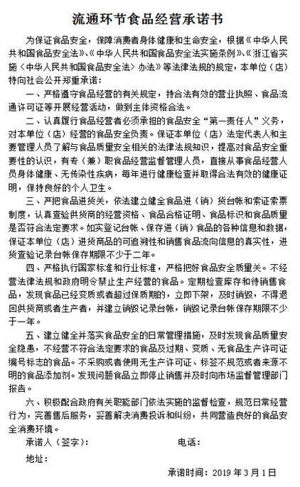 食品安全關(guān)系到每一個人的生活,關(guān)系到社會的發(fā)展和穩(wěn)定。為保障消費者的健康權(quán)益,確保商業(yè)城各市場食品安全,連日來,蕭山商業(yè)城信息信用辦組織人員對副食品、五金、太平洋市場內(nèi)與經(jīng)營食品相關(guān)的經(jīng)營戶,包括部分小店及餐飲店,簽訂2019年度《流通環(huán)節(jié)食品經(jīng)營承諾書》,共簽訂承諾書近400份。