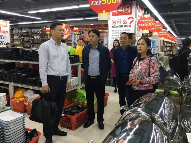 在高橋大市場股份有限公司副總經理彭志剛的帶領下,夏國燕一行先后參觀了酒店用品城、文體用品城、現代商貿城、酒水食品城、茶葉茶具城、酒店用品城,現場了解各個市場的定位和特點,深入了解商戶經營狀況,感受高橋大市場在大型綜合市場管理與發展上的先進理念。