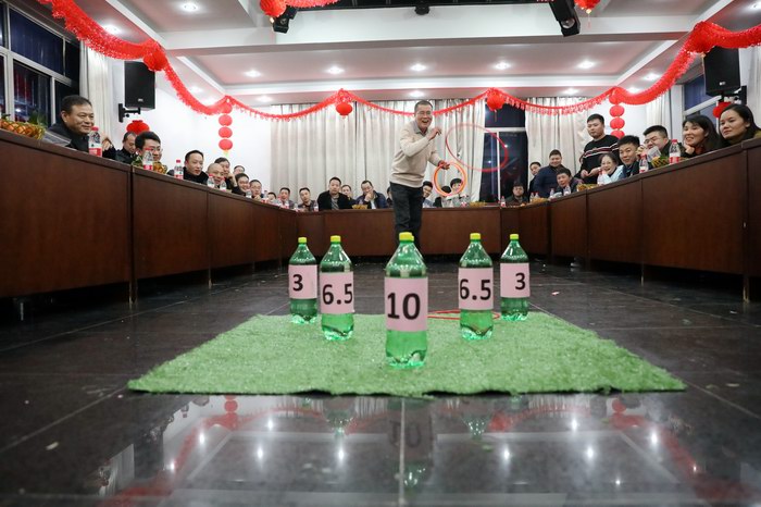 隨后開(kāi)始四個(gè)游戲活動(dòng),每位會(huì)員都有參賽項(xiàng)目:一是“詞語(yǔ)接龍”。每個(gè)組派5名隊(duì)員參加,工作人員手里準(zhǔn)備了10張紙條,每張紙條上有個(gè)字,各組選手派一名代表抽簽,抽中的那個(gè)字開(kāi)始詞組接龍,第二名選手從第一個(gè)詞組的最后一個(gè)字開(kāi)始接龍,時(shí)間1.5分,最終哪個(gè)隊(duì)接龍的詞組多為勝者。二是“看這里”。游戲的規(guī)則是每個(gè)組派5名隊(duì)員參加。5個(gè)人前后列隊(duì),工作人員在距離第一個(gè)人1米前說(shuō)“看這里”,雙方分別在同一時(shí)間完成以下動(dòng)作:エ作人員將卡通手牌指向上下左右任意一方,第一個(gè)人的面部方向必須朝著其他三個(gè)方向,如果是同一方向就會(huì)被淘汰,勝者排到隊(duì)伍后面繼續(xù)參與,猜對(duì)一次記一分,總時(shí)間在1.5分鐘之內(nèi)以小組總分排列名次。三是“投圈贏大獎(jiǎng)”。每隊(duì)派3個(gè)人,距離投圓線3米遠(yuǎn)的地方放6個(gè)不同分?jǐn)?shù)的瓶子,每個(gè)人有10次投圈的機(jī)會(huì),3個(gè)人累計(jì)套中瓶子的分?jǐn)?shù)相加為本隊(duì)的總得分,以小組總分排列名次。四是“傳花擊鼓”。一名工作人員擊鼓,在坐的員工傳花,鼓停花停,工作人員將手中若干張紙條叫持花的人任意抽一張,按紙條的內(nèi)容開(kāi)展活動(dòng),完成任務(wù)有獎(jiǎng)。