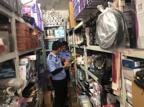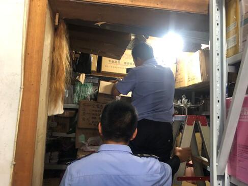 工作人員對相關店鋪營業房和倉庫進行仔細排查,對此前在倉庫內查到過松香水、大批量特硬發膠的店鋪更是加大排查力度,不放過任何一個角落。