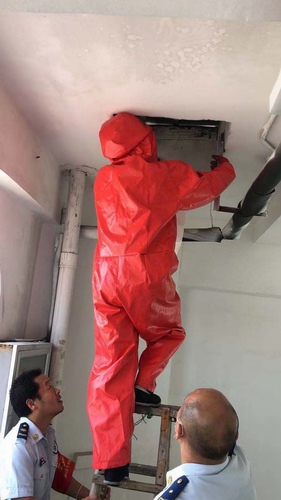 該兩處馬蜂窩分別處在華東副食品市場住宅樓的北二區六樓消防栓邊上以及北三區306室。蜂窩似籃球大小,看起來非常震撼,蜂窩外密密麻麻的爬著許多馬蜂并發出“嗡嗡嗡”的聲音。根據現場狀況,為及時消除隱患,保護居民人身安全,商住辦聯合城內消防隊員,穿上厚重“防蜂”戰斗服,帶上相應的“捅”馬蜂窩工具,并帶上編織袋和殺蟲劑,利用人字梯爬到高出將馬蜂窩摘除。成功清除馬蜂窩后,商住辦管理人員召集周圍住戶,向大家一一講解如何安全避險和處置常識。