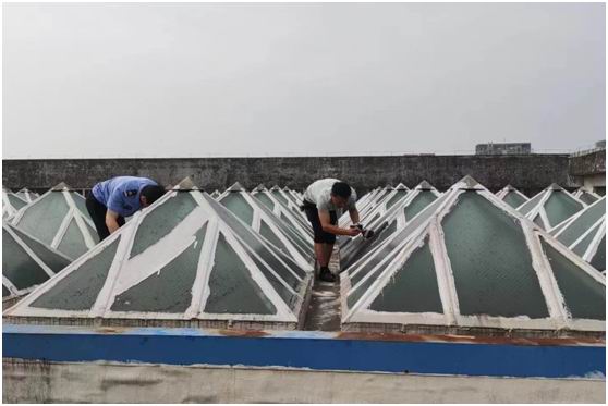 由于市場玻璃頂棚接縫處涂料干裂,有輕微滲水情況。雨停后,管理人員立即上屋頂對滲水處進行修補,讓經營戶貨物免受損失。
