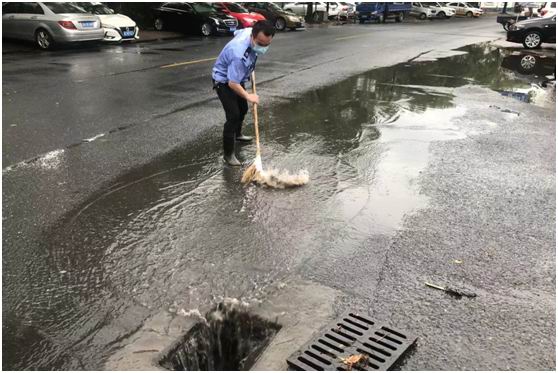 管理人員對屋頂雨水管道進行檢查將樹葉、垃圾等堵塞物清理干凈,對積水路面進行清掃,保障行人安全。