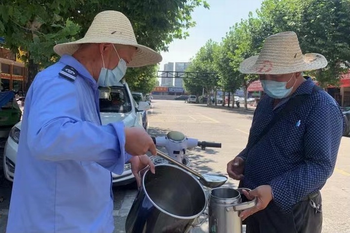 在這樣的烈日之下,蕭山商業城停車管理員仍堅守在自己的崗位上,戴著口罩,頂著草帽,辛勤付出著。部門領導第一時間決定開展“愛心綠豆湯,夏日送清涼”行動,為辛苦在一線的勞動者送上愛心綠豆湯,讓他們在忙碌的工作中感受夏日的清涼。