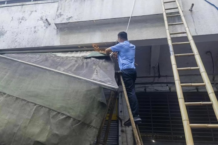 日前,五金市場組織管理員對一樓C部254號外立面年久失修的遮陽棚進行拆除,排除了安全隱患。
