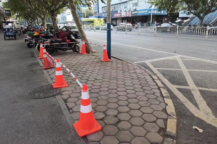 10月13日,五金市場管理人員把護欄,招牌,樁頭設置好,并在經營戶宣傳設置臨時卸貨區的信息。