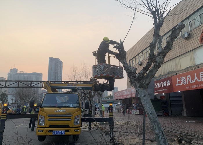 前期,公司聯系區市政綠化養護保障中心和樹木修剪公司對路面樹木進行了全面的勘查和評估,確定了樹木的修剪方案。經過為期三天的作業,施工方按照“一樹一策”的原則,量身定制修剪方法,精準實施提干整形,并對枝條進行了稀疏處理,以確保樹冠的穩定和平衡,期間共完成修剪梧桐樹102株、香樟樹36株。