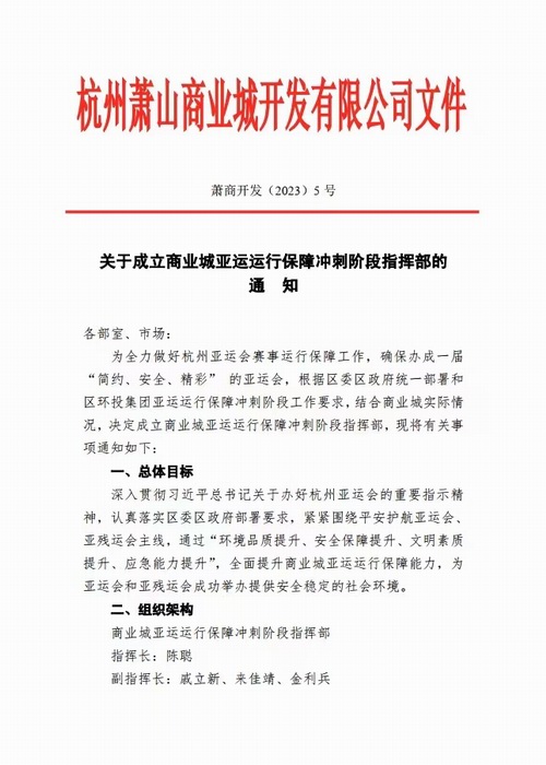 ▲ 公司第一時(shí)間制定了商業(yè)城亞運(yùn)運(yùn)行保障沖刺階段工作方案,成立指揮部,明確責(zé)任領(lǐng)導(dǎo)、責(zé)任部門、工作職責(zé)和各項(xiàng)工作的時(shí)間節(jié)點(diǎn)。