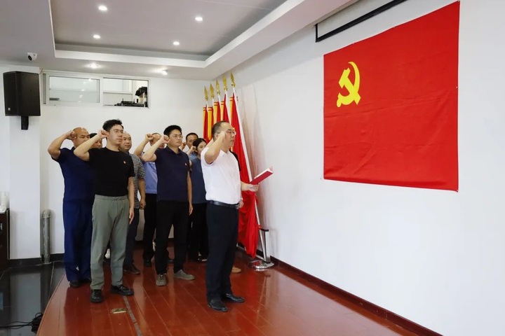 陳聰帶領4-6月份入黨的黨員同志重溫入黨誓詞,并送上生日寄語。