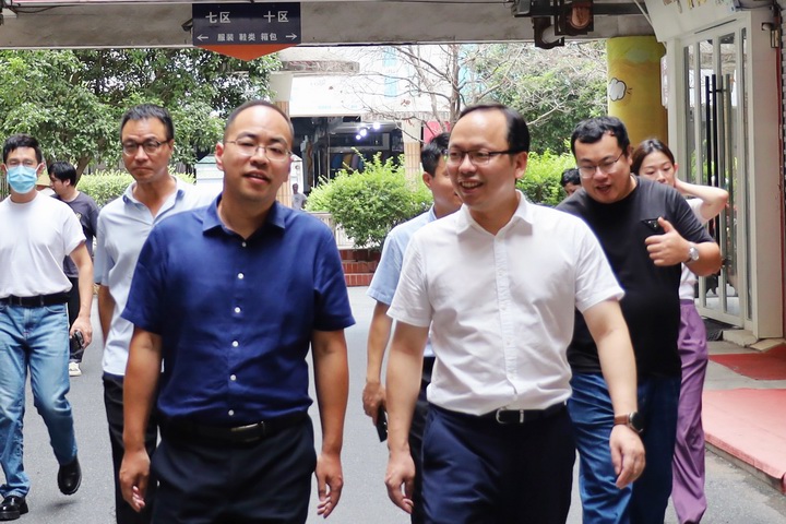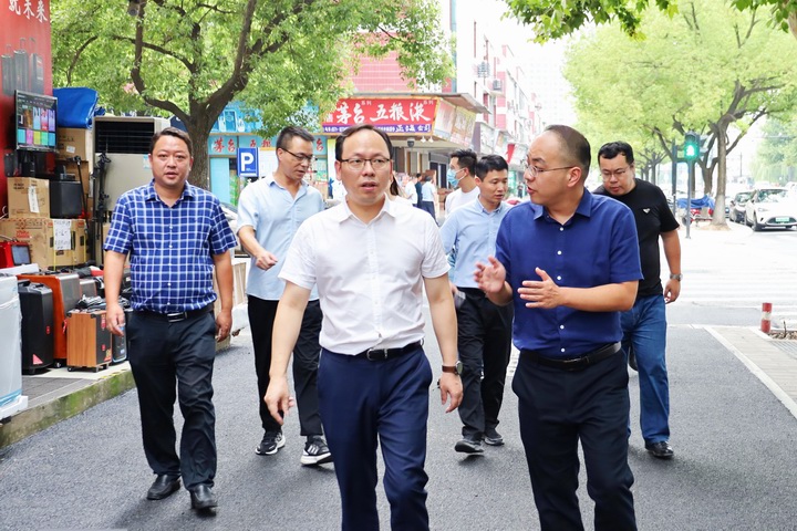 孔樂一行來到商城中路,對沿線的市場立面、基礎設施修繕和弱電架空線“上改下”整治工作進行了現場察看。