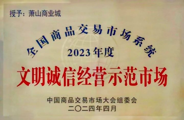 喜報|蕭山商業城榮獲“全國商品交易市場文明誠信經營示范市場”榮譽稱號