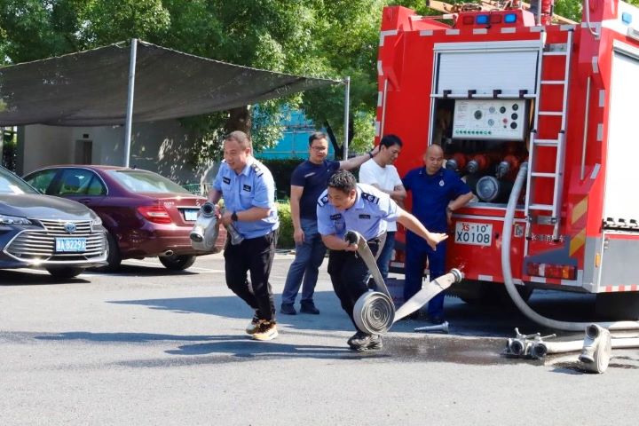 演練分為兩個項目,首先是手持滅火器撲救油桶火災,參與者們在專業指導下迅速而準確地使用滅火器將火焰撲滅,展示了高效的個人應急反應能力。緊接著是兩人協作的水帶連接出水打靶環節,這一項目考驗了團隊之間的配合以及對消防設備的操作熟練度。