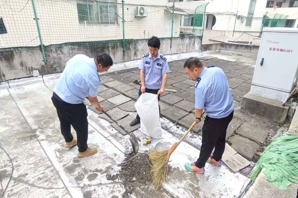 工作人員攜帶掃帚、鐵鏟、編織袋等工具,對枯枝落葉、塑料瓶、廢舊廣告牌、建筑垃圾等進行分類清理,對小廣告和頑固污漬進行沖洗消殺,同時針屋頂部分區域積水問題,進行了清掃和下水管道疏通。