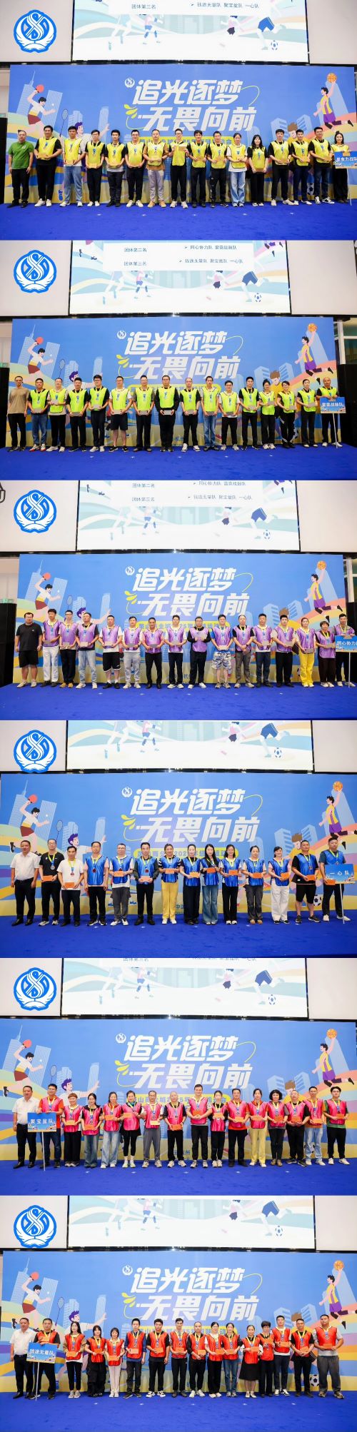 經(jīng)過激烈角逐,本屆趣味運(yùn)動(dòng)會(huì)各項(xiàng)賽事圓滿落幕。根據(jù)積分統(tǒng)計(jì)結(jié)果,最終評(píng)選出各獎(jiǎng)項(xiàng)獲獎(jiǎng)隊(duì)伍。在頒獎(jiǎng)儀式上,各獲獎(jiǎng)代表隊(duì)代表依次上臺(tái)領(lǐng)獎(jiǎng),并與頒獎(jiǎng)?lì)I(lǐng)導(dǎo)親切合影留念。