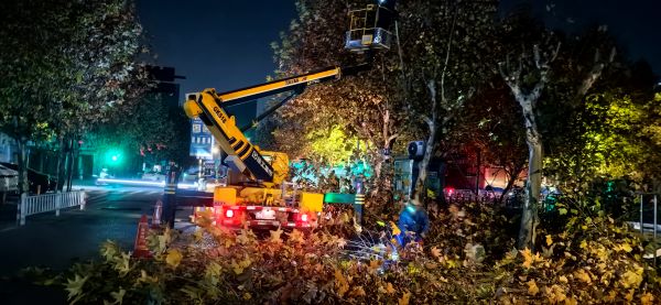 前期,公司對(duì)接第三方樹(shù)木修剪公司對(duì)修剪現(xiàn)場(chǎng)進(jìn)行了勘查和評(píng)估,確定了樹(shù)木的修剪方案。同時(shí),以告示的形式向城內(nèi)商戶、住戶張貼為期10天的公告后開(kāi)展樹(shù)木修剪工作。