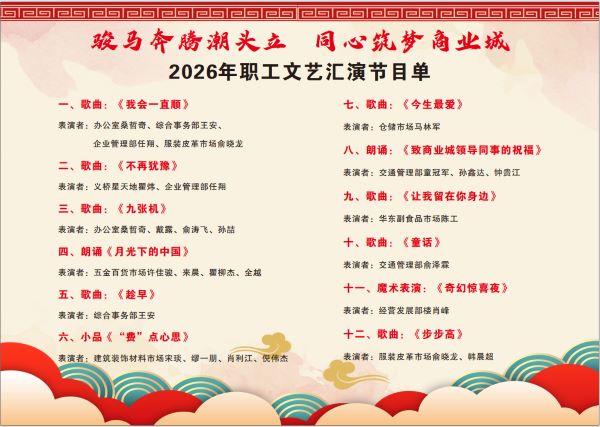 為喜迎2026年春節,增強職工團隊凝聚力,2月12日晚,蕭山商業城“駿馬奔騰潮頭立·同心筑夢商業城”2026年職工文藝匯演在喜慶祥和的氛圍中拉開帷幕。這場由商業城職工自發策劃、全心投入并共同呈現的文藝盛宴,以豐富多彩的節目形式,構筑了歲末年初一段充滿溫度的集體記憶。